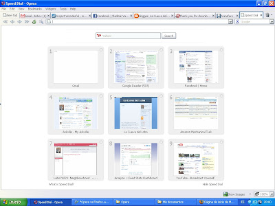 Comienzo entonces a navegar con Firefox y lo primero que me comienza a hacer falta es mi «Speed Dial», esta es una funcionalidad de Opera. Cuando abro una nueva tab o pestaña en Opera, esta me muestra una pantalla con 9 iconos, en donde yo he guardado previamente 9 páginas que visito con frecuencia, en mi caso como pueden ver, mi correo, mi lector de noticias, facebook, askville (trabajo), mi Blog, mechanical Turk(trabajo), last.fm, las estadísticas de mi blog, y por supuesto, YouTube.
