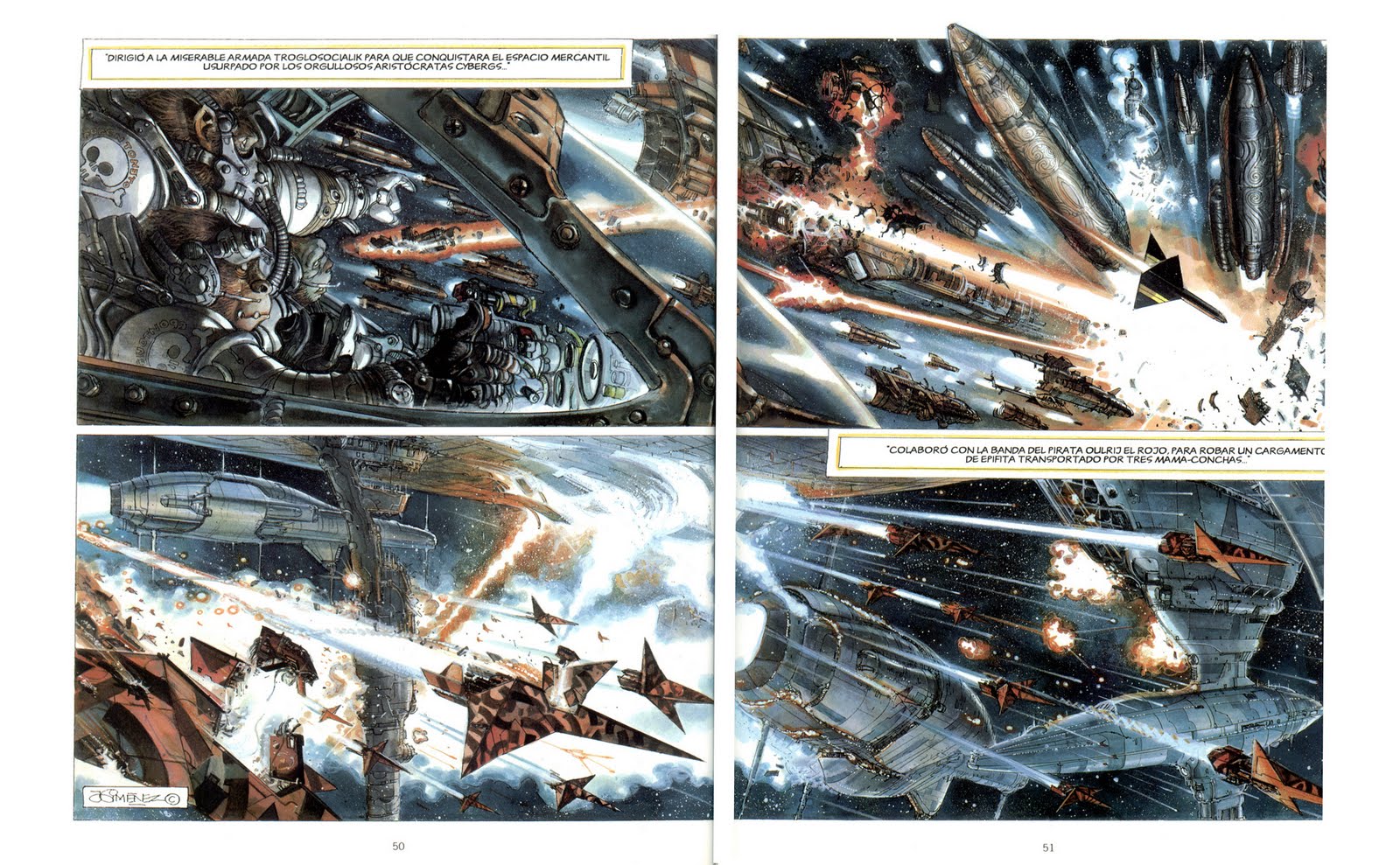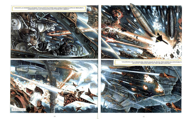 Este es un detalle que me fascinó, allí donde muchos autores de Space Opera se detienen, Jodorowsky siguió adelante y así como las batallas, las armas y las naves espaciales son majestuosas y grandilocuentes, también lo son el amor y el sexo.