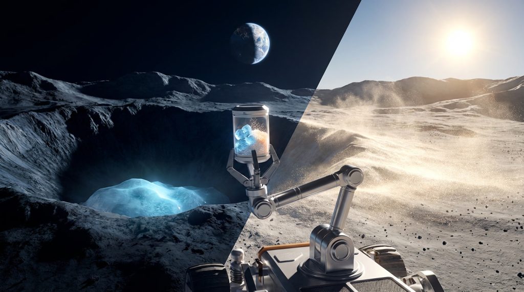 Pero hay algo aún más valioso que el Helio: el agua. Hemos confirmado que existe hielo en los cráteres de los polos donde nunca da el sol. Ese hielo no solo sirve para beber; al separarlo en hidrógeno y oxígeno, obtenemos aire para respirar y combustible para cohetes. La Luna no es solo una mina, es nuestra primera «gasolinera» espacial. La gran ventaja es que el combustible ya estaría allá arriba, y sacar ese combustible de la Luna sería mucho más sencillo y económico que levantarlo desde la Tierra.