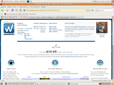 Anoche, antes de irme a dormir chequee mi cuenta de Project wonderful y descubrí que ya había alcanzado los diez dolares para el concurso, si leyeron el post anterior, evidentemente ya lo saben, pero quería ponerles la imagen del momento 😉