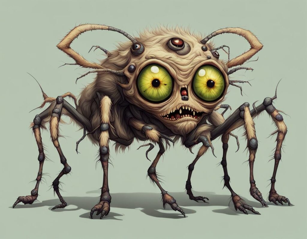 Tres, cuatro, cinco, seis patas llenas de un pelo corto y marrón. Tres bocas de diferente tamaño y con dientes creciendo en todas direcciones. Demasiados ojos para contar. Y dos pares de alas como los de un insecto.