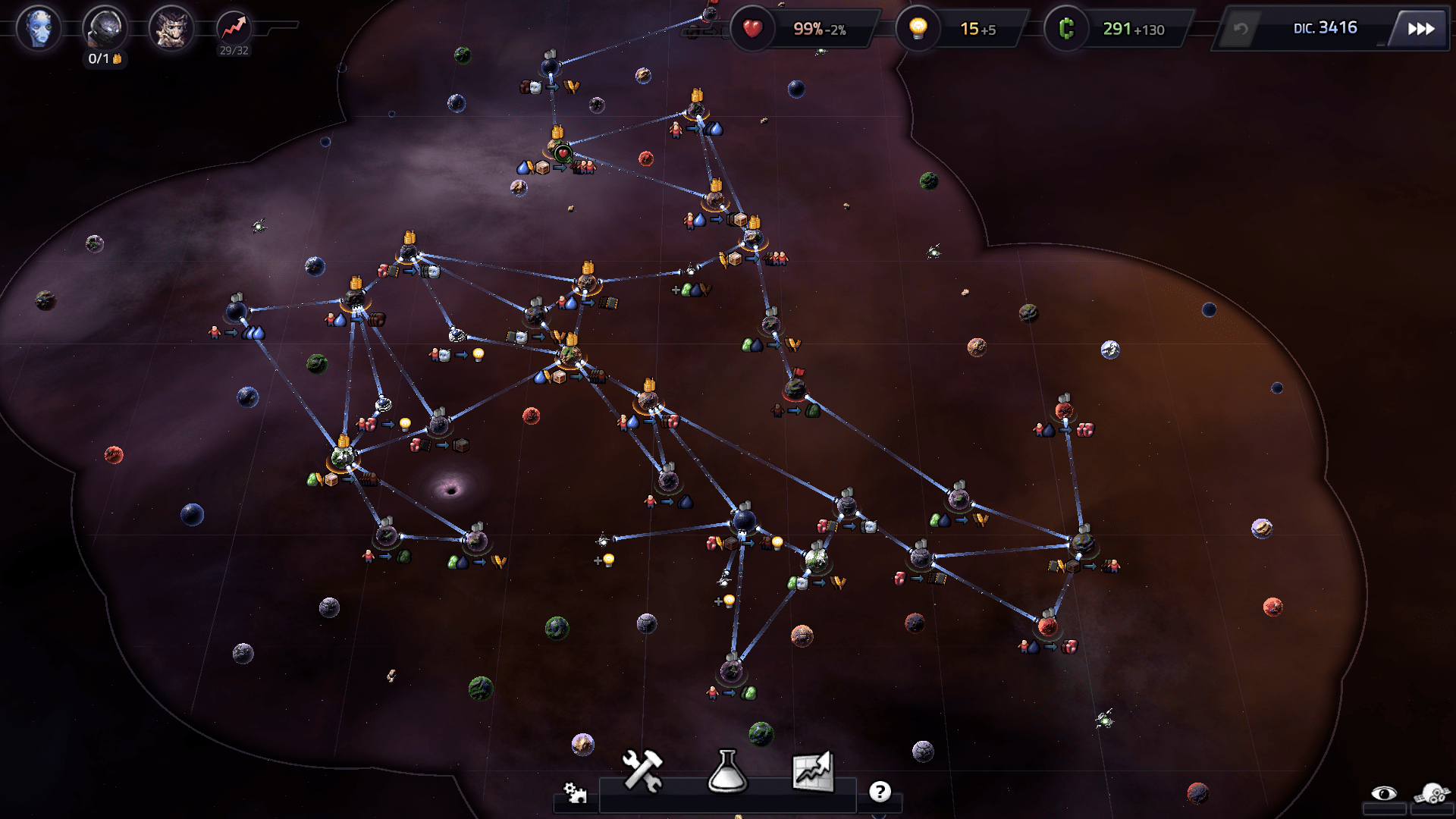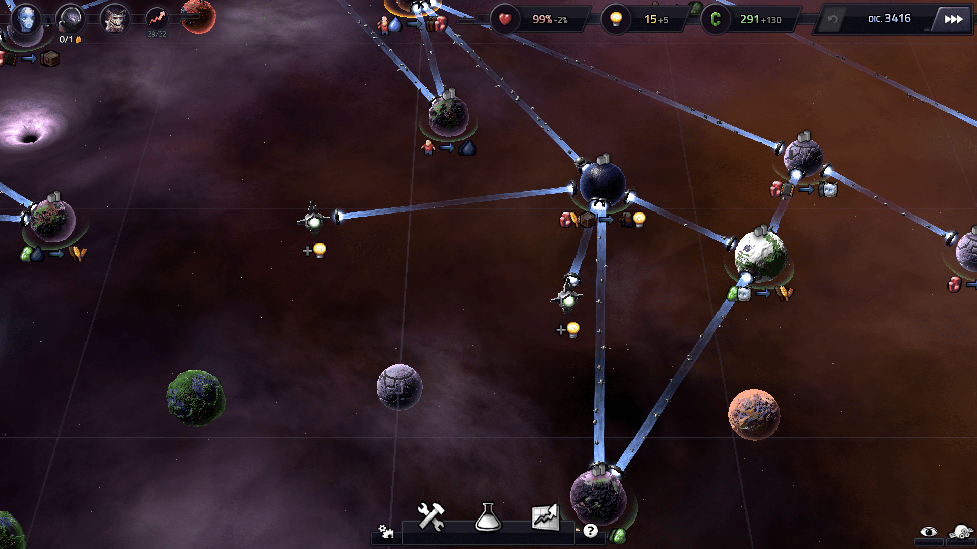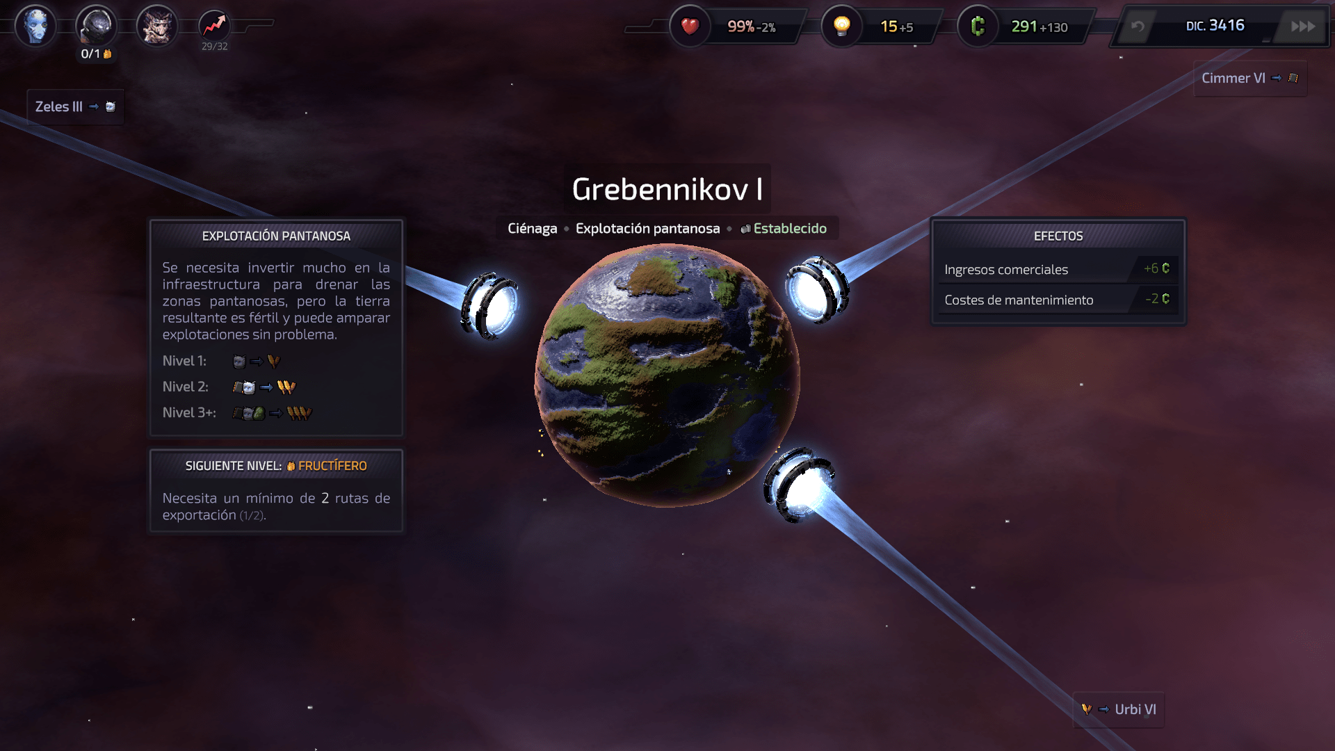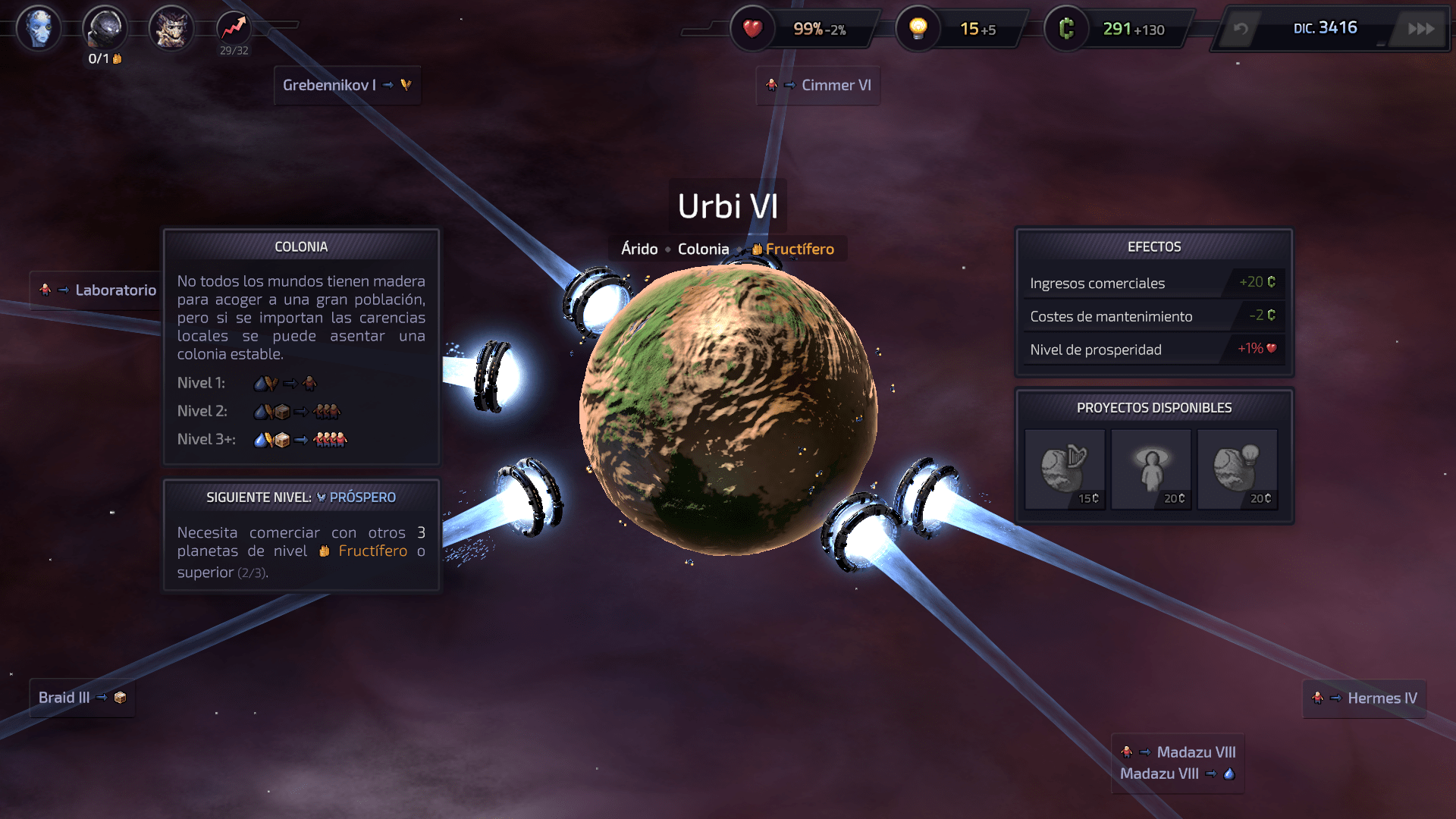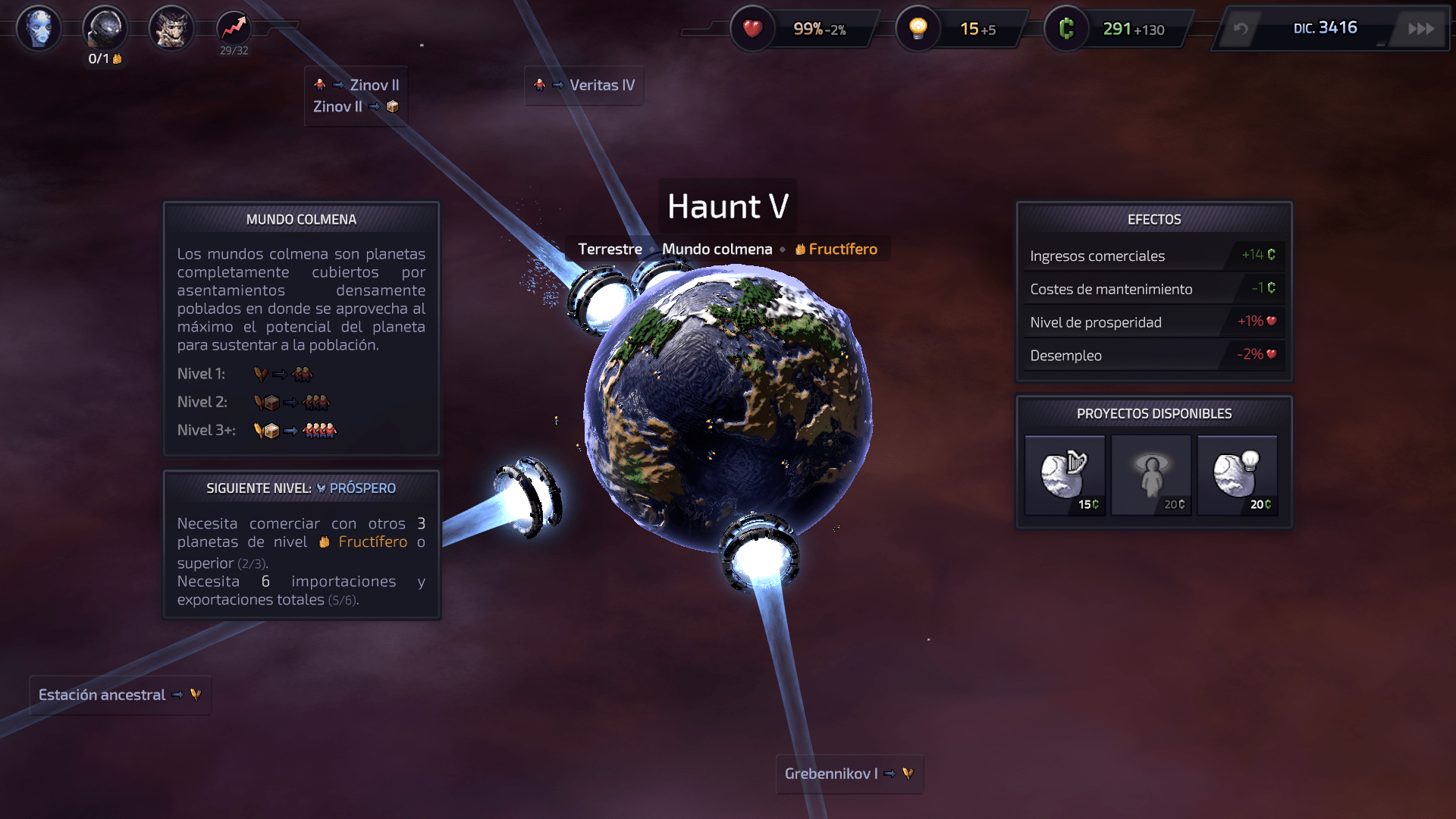Luego hacernos una idea de ¿Cómo podemos aprovechar mejor los recursos que tenemos a nuestra disposición? Pero es muy importante que al comienzo tengamos cierta estabilidad. ¿Qué quiero decir? Pues que es mejor que nos aseguremos que nuestros planetas están produciendo recursos que se complementen los unos a los otros. Y que tenemos cubiertas al menos todas las necesidades básicas de esos primeros planetas. Porque si dejamos uno o dos planetas «sufriendo» por falta de recursos básicos por mucho tiempo, eventualmente eso nos va a salir costoso, pues la infelicidad se va acumulando. Y no solo eso, sino que incluso si más adelante conseguimos resolver el problema, el planeta queda «resentido» por mucho tiempo.