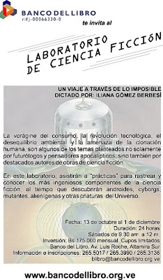 Mi amiga, Iliana Gomez, estará dictando un taller de Ciencia Ficción en la ciudad de Caracas, en las instalaciones del Banco del Libro, el taller comenzará el 13 de Octubre y terminará el 1 de Diciembre.