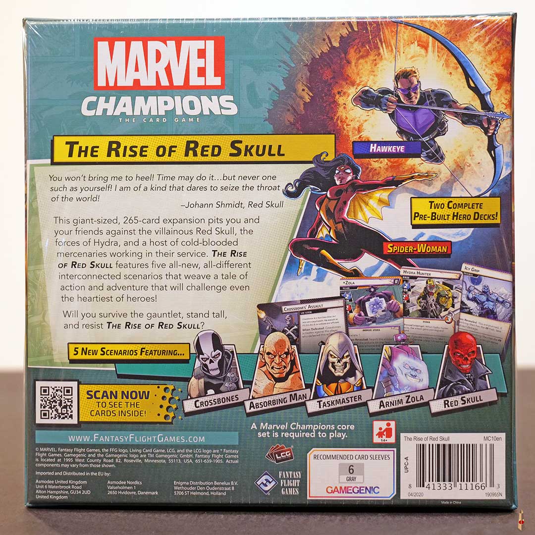 The Rise of the Red Skull es una nueva expansión del exitoso juego de cartas Marvel Champions. En esta ocasión el juego viene con dos nuevos héroes, Hawkeye y SpiderWoman, quienes se enfrentarán a los villanos Crossbones, Absorbing Man, Taskmaster, Zola, y por supuesto Red Skull, quienes están atacando el Proyecto P.E.G.A.S.U.S. en donde La Fuerza Aerea, la Nasa y S.H.I.E.L.D. están estudiando el Teseracto.