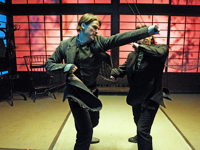 Bunraku es un film inusual, no solo por su estética que combina elementos de la vida real, con los propios del teatro Bunraku. No solo porque tiene una estética que evoca a Sin City y 300. No solo porque me costó ubicarla en un género. Yo pensaba que era ciencia ficción post-apocalíptica (que tiene algo de ello) aderezada con un ligero toque pulp (que lo tiene) condimentada con un ligero toque dieselpunk y un sabor a cine noir (que lo tiene, sobre todo en la estética) sino por los diálogos, que suelen ser muy profundos, muy orientales. De verdad asombroso.